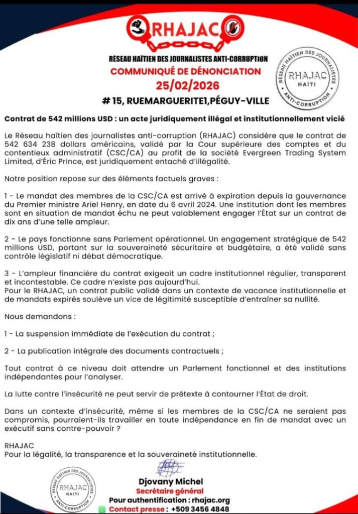 Port-au-Prince, 25 février 2026 — Le Réseau haïtien des journalistes anti-corruption (RHAJAC) a publié, ce mardi, un communiqué de dénonciation relatif à un contrat de plus de 542