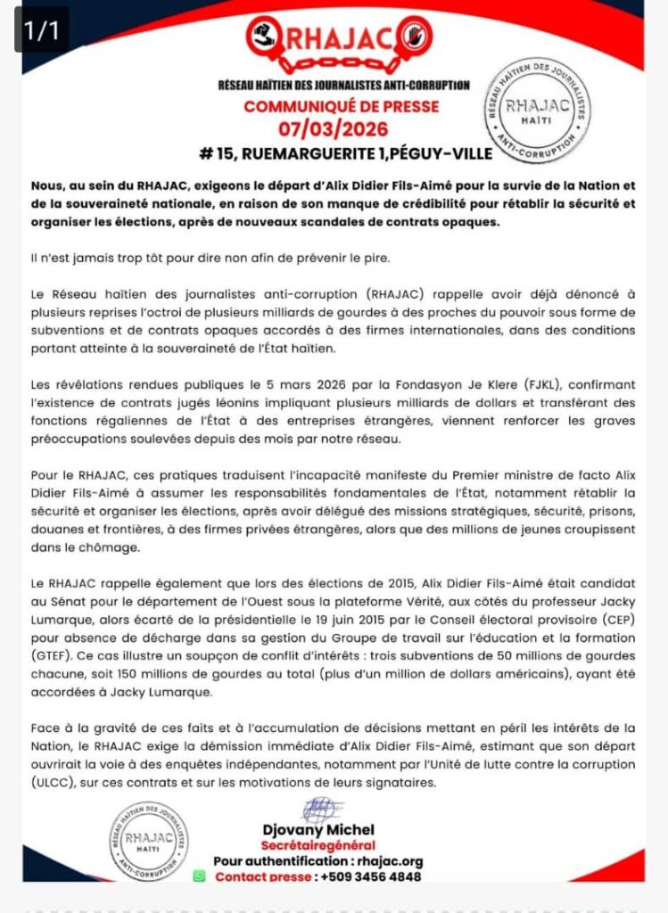 Port-au-Prince, 7 mars 2026 — Le Réseau haïtien des journalistes anti-corruption (RHAJAC) a réclamé la démission immédiate du Premier ministre de facto Alix Didier Fils-Aimé. Cette demande intervient