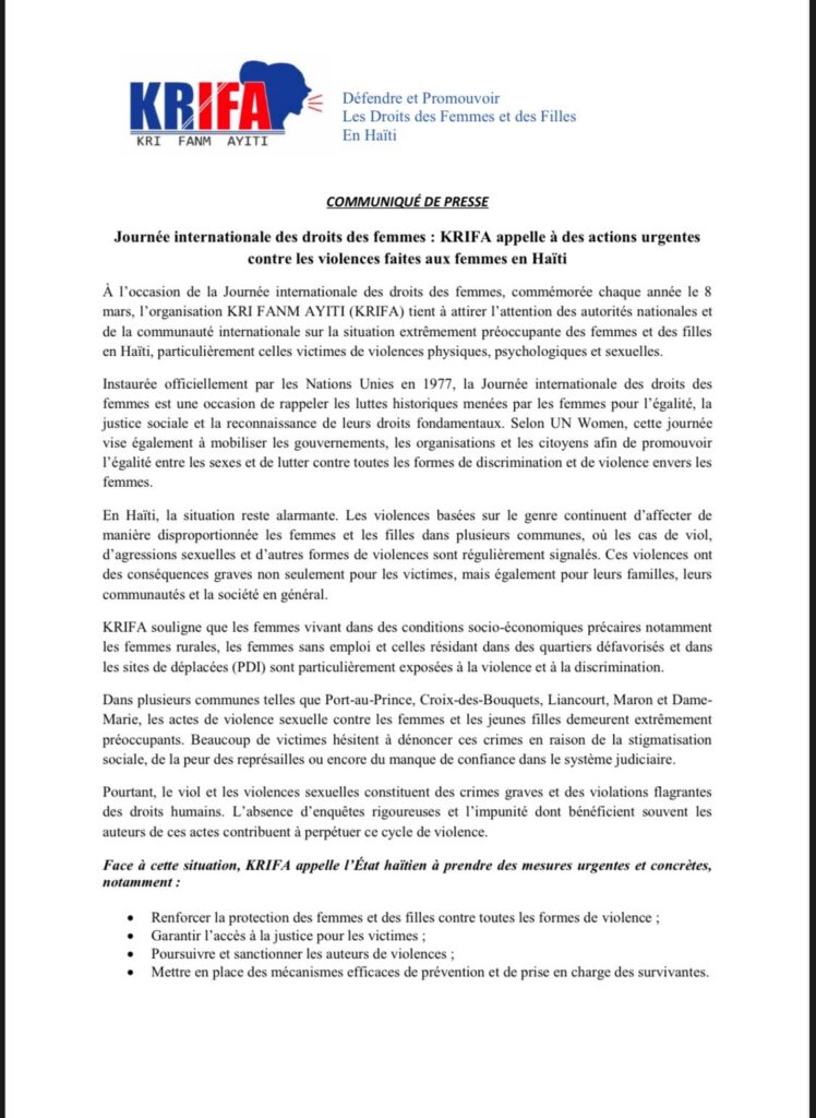Le communiqué est signé par Me Guerlyne Résidor, Directrice exécutive de KRIFA, à Port-au-Prince, le 8 mars 2026.